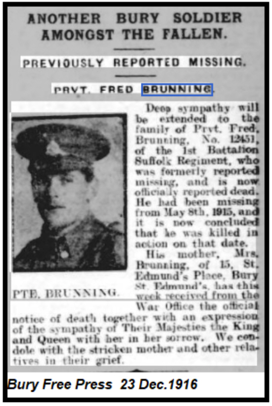 1891 census...Aged 3 months, he was at 15 St.Edmunds Place, Bury St.Edmunds, with his father Edward BRUNNING [45] labourer born Icklingham; his mother Mary Ann [43] born Felsham; brother Arthur [16] errand boy; sisters Alice [9] and Ellen [5]. All the children were born in Bury St.Edmunds 1901 census...Aged 10, he was still at 15 St.Edmunds Place with his parents 1911 census...Aged 20, a draper's porter, he was still at 15 St.Edmunds Place with his widowed mother. His father had died in 1902. |