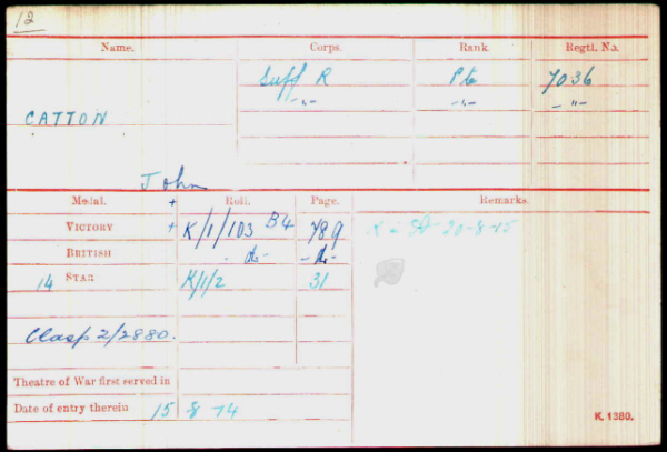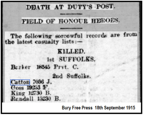 1881 census...Aged 2 months, he was at 2 Mill Yard, Mill Lane, Bury St.Edmunds with his father James CATTON [28], tinman; his mother Jane [28]; brother Charles J [4] and sister Emma[3]; grandmother Mary A [56] London born. Except for Mary, all were born in Bury St.Edmunds. His mother died in 1886 1891 census...Aged 9, a pauper, he was in the Thingoe Union Workhouse in Bury St.Edmunds. Also there was William CATTON, aged 7. William was his brother and perhaps also the mystery William CATTON on the roll of honour? Brother Charles James was in Saltash, Cornwall at "Mount Edgecumbe" the Industrial School Ship on the River Tamar.. 1901 census...Not found in this census.It is possible he was overseas in the Army He married Carisbrooke born Milly REDSTONE [5-9-1874].on 26th December 1910 at the Wesleyan Chapel, Newport, Isle of Wight. He was in the 2nd Bn, Suffolk Regiment stationed at Barossa Barracks, Aldershot. Milly, of 131 Kimberley Terrace, Hunnyhill, Newport, Isle of Wight. was the daughter of the late Thomas William REDSTONE, bricklayer. He gave his age as 29. 1911 census...Not found in this census but he was in the Suffolk Regiment. His new wife was with her single brothers Ashley and Hubert at 131 Hunny Hill, Newport. Possibly his father ( a market porter) a widower aged 60 was lodging at 10 Long Brackland, Bury St.Edmunds. Brother Charles J was married, a Sergeant in the Suffolk Regiment at barracks in Bury St.Edmunds. His brother Charles died in France 0n 13th October 1915 see here |