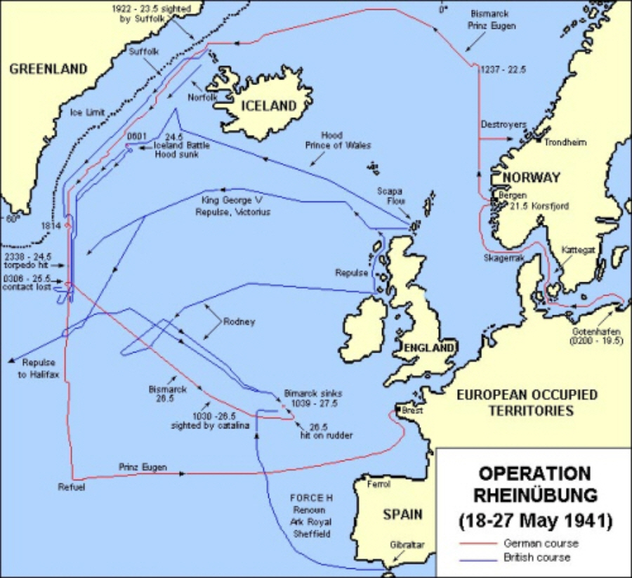 flaw in 1941. The "Bismark" and "Prinz Eugen" broke out into the Atlantic where they would have created havoc amongst Allied shipping. The Royal Navy pursued them with "Hood" and "Prince of Wales" but lost them for a time at night and in fog, but the cruiser "Suffolk" re established contact early on the 24th May 1941. "Prinz Eugen" hit the "Hood" from about 22 Km and ignited some anti aircraft shells on deck, not a great problem, but then the "Hood" was hit by a salvo of high trajectory shells from "Bismark". One is believed to have pierced the deck armour, exploding one of the magazines. This tore the "Hood" in half and she sunk within 2 minutes taking 1,415 men with her, just three men survived. "Prince of Wales" was forced to disengage due to damage but not before hitting "Bismark" three time, which damage caused the Bismark to turn to return to safety in occupied France. Before she could do that she was intercepted by aircraft from "Ark Royal" who damaged her sufficiently for the "Rodney" and "King George V" to catch up and sink her. |