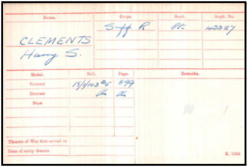 1901 census...Aged 3, he was at Highfield Gate, Fulbourn with his father James W. CLEMENTS [46] a blacksmith born in Fulbourn; his mother Ellen Ann [34] born in Fulbourn, and brothers James R.W. [12] born in Exning and Percy C. [8] born in Fulbourn. 1911 census...Aged 13, a farm labourer, he was at 5 Carlton Grange Cottages, Carlton, with his parents ( father now a carpenter) and brother Percy (farm labourer) |