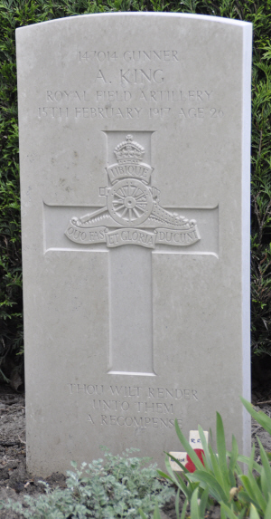 He enlisted in Newmarket. Most Divisions had three Medium Batteries, designated X, Y and Z. For example, in the 38th Division they would be X.38,Y.38 and Z.38, hence Arthur was with 38th Division, in the Ypres salient. Trench Mortar Companies were not the most popular of units, since once they started firing it was invariably a signal for a counter barrage from the enemy. Which exact unit Arthur was attached to and exactly where is not known. The Bury Free Press of 10th March 1917 reported the death of Prvt Arthur King whose wife received the announcement by a letter from a comrade that he had been killed by a shell in France. Prvt King, who leaves a widow and two young children, came from Fordham to Chippenham less than two years ago as gardener to Col.A.W.Tate of the Manor House . |