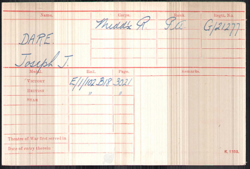 Joseph John Dare was born in Clare (Risbridge Q3-1888 4A:623), baptised in Clare on 16th September 1888, son of Joseph and Tamar DARE