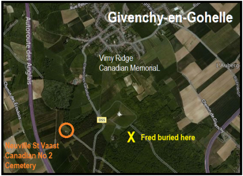 5 feet 8.5 inches (174 cm)tall, weighed 155 lbs (70.5 kg), chest 34" to 37" (86.4 to 94 cm), blue eyes, light brown hair,Church of England. As No 252675 he was placed in the 209th Battalion. Embarked on 1st November 1916, arriving in England on 11th November. From Shornecliffe he was posted to the 102nd Battalion and sent to France on 6th December 1916. He was killed in action at Vimy Ridge, buried at 44a.S.22.a.8.3., 0.75 miles south of Givenchy en Gohelle. This grave was lost, hence the special memorial at Neuville St Vaast, Canadian Cemetery No.2 CWGC records show the battalion had 119 killed that day. |