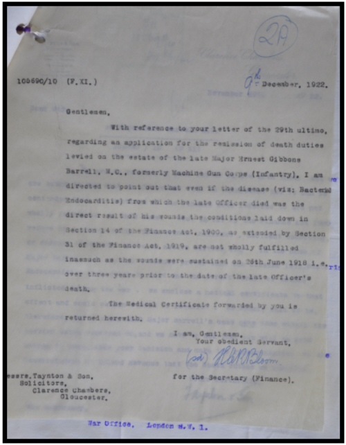 a student. 16th October 1916 he was 2nd in command of his company and on 4th July 1917 promoted to acting Captain, i/c 103 Company. He was gazetted 1st January 1918 Military Cross:- T/Lt. (A/Capt.) Ernest Gibbons Barrell M.C. M.G.Corps. For conspicuous gallantry and devotion to duty during an enemy attack. Under heavy fire he continually made personal reconnaissances (sic) to get in touch with the situation. He sent back most valuable information at a time when most of the signal wires were cut. He did splendid service. He was promoted to Acting Major in February 1918, and wounded in action by an enemy aircraft on 26th June 1918 near Amiens. This gunshot wound (penetrating chest) him resulted in attending No.54 Field Ambulance, then via 41st C.C.S. to No.5 General Hospital, Wimereux before being evacuated to UK on HM Hospital Ship "St.Andrew". Admitted to Hall Walker Hospital, Regents Park, London on 14th July 1918, sent to Somerville (3rd Southern General Hospital, Oxford on 29th October 1918 from where he was discharged to home on 22nd November 1918, pending discharge. From then on it seemed there was a continual battle with the Army to obtain a war or wounded gratuity and after his death his widow struggled to obtain a refund of death duties, which seems to have been unsuccessful. He was awarded a bar to the Military Cross but the date is illegible on his documents. He was discharged as a result of his wounds, to The Square, Witney, Oxfordshire, (silver war badge No. 314445) and died on 15th February 1922. The note below clearly indicates a medical opinion that his wounds were responsible for his death. The Commonwealth War Graves Commission however have a cut off date for the Great War of 31st August 1921. The gap between his wounding and death was deemed too long to satisfy the Inland Revenue when asked to refund death duties. His medals were sold for £1,800 at auction (DNW) on 30th March 2011. |