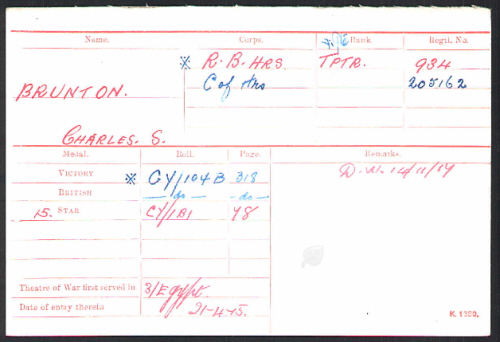Charles Samuel BRUNTON was born on 18th February 1897 (Aylesbury Q1-1897 3A:784), baptised in Aylesbury on 16th May 1897, son of Reyner Mayne and Ada Emily BRUNTON (née OLNEY).