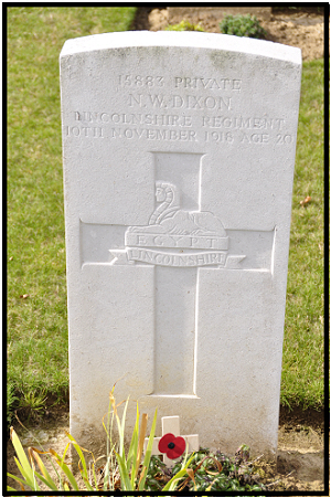 He enlisted in March 1915 in Gainsborough, Lincs, when he must have lied about his age. "Soldiers Died", incorrectly, has him born in Gainsborough. He died of bronchial pneumonia in No.45 Casualty Clearing Station at Awoingt. His legatee was Miss Lilian DUKE. The Gainsborough News of 22nd November 1918 reported:- DIXON, N.W. Pte. Lincolns We regret to have to record the loss of Pte Neville W. Dixon, another Gainsborough boy, the son of Mr & Mrs H K Dixon of 3 Arthur Road and late of Gringley on the Hill. Pte Dixon was one of those brave lads who felt the call of his country in the early stages of the war and joined up in March 1915 when only 16 years of age. After 4 months training in the Lincolns he was sent to Gallipoli where he received a gunshot wound to the knee which invalided him to the Palace Hospital in Cairo. In June 1916 he was called to France with many others and was present at Messines Ridge in 1917 and was gassed at Loos in March 1918 and was sent to England. On recovering he went to Ireland and to France in September last. Towards the end of October he was the victim of the influenza which turned to Bronchial Pneumonia and terminally fatal, in spite of the best nursing possible in the 45th Casualty clearing hospital on November 10th. Pte N Dixon was educated at the Gainsborough Grammar school, finishing at the East Anglia School, Bury St Edmunds and afterwards was apprenticed with Mr H C Lee of Silver Street. He was a bright and cheery disposition which helped him through many depressing circumstances and his many friends will regret that a career so full of promise has been thus suddenly ended. In the midst of the great rejoicing it is exceptionally hard for the parents, who having been looking forward to their boy's safe return receive instead the notification of his death, we are sure that everyone's sympathy goes out to this and any such cases in the neighbourhood. |