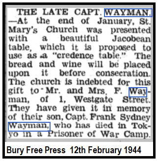 1911 census... Aged 5, he was at 59 Elmer Road, Catford, with his father Frank WAYMAN[32] surveyor's assistant born Westminster and his mother Sarah Ann [32], born Greenwich. Frank is commemorated on the memorial plaque of King Edward VI Grammar School in the Cathedral, but WAYMAN, Captain Frank Sidney, BSc, AMILCE, R.E. was at the East Anglian School spring 1916 – 1917). In 1928 he was at 25 Northcott Avenue. Wood Green N22. In the 1939 register at 1 Westgate Street, Bury St.Edmunds were his father Frank [29-7-1878] a surveyor/valuer; his mother Sarah A [29-1-1879] and sister Margaret E [15-6-1916]. Possibly he was the F.S.Wayman who sailed from London on the "Morea" on 10th August 1928, bound for Singapore. Records show a Frank S WAYMAN marrying Violet G DIX in 1933 in Edmonton. He was accompanied by his wife (not named) when he sailed from London to Singapore on 17th March 1933 on the "Carthage". It appears that on his return to UK in 1937 his wife was recorded as Violet, they were with their daughter 3 yrs old Margaret( they were visiting his parents). He was accompanied by his wife (Violet Gladys DIX) and 3.5 years old child when leaving London on 24th February 1938 for Singapore on the "Rawalpindi". An Ancestry record gives Violet as dying in Singapore in 1939, but no source given. He married Kathleen Miriam (?). of 19 St. Andrews Road, Caversham, Reading, Berkshire. His marriage details have not been found, possibly he married in Singapore. This will require a copy of the certificate if possible. His will gives his widow as Kathleen Miriam WAYMAN