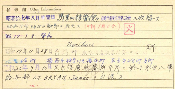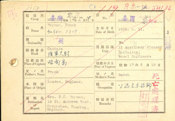 Frank worked for Malayan Public Works Department and was attached to the 13th Pioneer Battalion, Indian Engineers. The majority of the personnel were from Singapore and were captured at the surrender of Singapore to the Japanese on 15th February 1942. He was shipped to Taiwan on 16th August 1942 and died of beriberi when working in Tokyo No.1 Dispatched camp (Mitsubishi Dock, Yokohama). |
