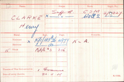 Suffolk Regiment with over 500 casualties.All of the officers became casualties. 11 Officers and 111 men were killed. Co-incidentally this was the same day that Lt. Alec Pearmain KING died in Chippenham in a shooting accident whilst on convalescent leave from the 12th battalion This man caused some problems connecting him with Exning, but luckily it was spotted that a pencilled entry on one Army form gave his intended address on release was Exning. This was further confirmed when in the death notices in the Bury Free Press of 4th November 1916 was an entry:- "CLARKE - Killed in action, on October 12th, 1916 in France, Company Sergt-Major H.G.Clarke, 7th Batt., Suffolk Regt. late of Conservative Club, Exning, then on December 2nd 1916, a fuller description of his death in the Bury Free Press:- POPULAR SERGEANT MAJOR KILLED It is with regret that we record the death of a gallant and popular Co.Sergt-Major, of the 7th Suffolks. The deceased soldier, Co.Sergt-Major H.Clarke fell in action on Oct.12th last. He possessed a fine, lengthy record of military service, and on more than one occasion he proved himself a brave and fearless soldier. Co,.Sergt-Major Clarke joined the Suffolks at Bury Depot when a lad. He went through the South African War, for which campaign he had the distinction of being awarded two medals. After serving his time he retired from the Army with a pension and for a period of three years he held the position of Steward of the Exning Conservative Club. He was called up again for service at the beginning of the war, and went out to France with the 7th Suffolks. Just before last Christmas he was wounded and sent to a hospital in England. After his recovery he returned to France, and fell in action on October 12th. He had many friends in Bury, to whom he was familiarly known as "NobbY", all of whom heard of his death with deep regret. Much sympathy is felt for Miss Percy of Bury St.Edmunds, to whom C.Sergt-Major Clarke was engaged. |