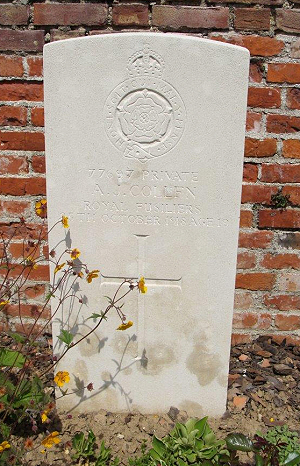 his father as John Collin 1901 census...at 2 York Cottages, Exning were Arthur Collen[1], his father John [33] carpenter/journeyman, born Soham...his mother Emma [31], born Exning ...brother John [9] born Exning...and sister Alice [8] born Exning 1911 census...at 7 Bradmore Terrace, Landwade Road, Exning were Arthur, his parents, brother Victor [5] born Exning and sister Dorothy [4] born Exning He enlisted in Ipswich. His elder brother John COLLEN had been killed a year earlier. A collector has both brothers' Death Plaque Arthur's entry in "Our Exning Heroes" reads as follows: Collen, A. Royal Fusiliers Arthur James Collen, a younger brother of John Richard, was only nineteen when he gave his life for his country. He enlisted at Christmas, 1917, and went out to France in the following May. He was one of the last of the Exning men to be killed, meeting his death on October 25th, 1918, less than three weeks before the Armistice was signed. His lieutenant writes that he was shot through the head by a sniper and died instantaneously without any pain whatever. He was buried by the Padre of the Hants Regiment at Chauseuis, near Le Quesnoy, in the English Cemetery. Before joining up he had worked for Mr. W.P. King. |
