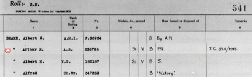 Born in Newmarket [Newmarket 3b:523]on 5th August 1889 to Frederick and Hephzibah DRAKE (née RAYMENT) of 1 Dore Cottages, Field Terrace Road, Newmarket 1891 census...at 1 Dore Cottages, Field Terrace Road,Newmarket were Arthur [1] with his father Frederick[28 a cabinet maker, born Newmarket, his mother Hephyibah [29] born Bottisham, sister Ethel Daisy [3] born Newmarket and sister Alice Emily [0] born Newmarket. 1901 census...at 16 St Philips Road, Newmarket were the same family, with the addition of Cecil F.W [4] born Exning (Exning or Newmarket were used variously as birth places in this area). 1911 census...Arthur was an Able Seaman at HMS Vernon. HMS Vernon was a group of 4 ships forming a torpedo school at Portsmouth, the Vernon; HMS Vernon I; Acteon and HMS Vernon IV. His parents with just Ethel and Cecil were still in St Philips Road |