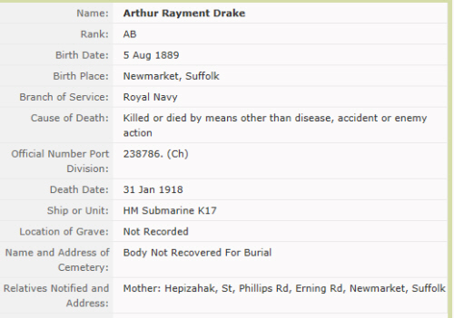 Arthur joined the Navy as a boy at HMS Ganges II on 5th August 1907, he was 5' 7" tall, and signed for 12 years service His postings were many, mainly submarine depot ships and schools, as here: 7/9/07 HMS Victorious [Majestic Class pre-Dreadnought Battleship] as Boy, then as Ordinary from 8/9/07 to 23/1/08 HMS Cochrane [ Duke of Edinburgh Class Armoured Cruiser]24/1/08 to 31/3/09 HMS Pembroke I[Shorebase] 1/4/09 to 5/4/09 HMS Thetis [ minelayer] 6/4/09 to 6/12/09 promoted Able Seaman 15/11/09 and to HMS Iphigenia [ Apollo Class Cruiser 7/12/09 to 10/3/11 HMS Vernon [shorebase - Portsmouth] 11/3/11 to 25/8/11........HMS Pembroke I [shorebase -Chatham] 26/8/11 to 23/9/11 HMS St George [shorebase - Gosport]24/9/11 to 18/11/12...... HMS Pembroke I [shorebase - Chatham] 19/11/12 to 13/12/12 HMS Bonaventure [submarine depot ship] 14/12/12/ to 9/4/13 HMS Vulcan [submarine school and depot ship - Gosport] 10/4/13 to 31/12/13 HMS Alecto [submarine depot ship] 1/1/14 to 16/2/14.....Vulcan [submarine school and depot ship - Gosport] 17/2/14 to 30/9/14 HMS Alecto [submarine depot ship] 1/10/14 to 7/11/14........HMS Forth [submarine depot ship - Devonport] 8/11/14 to 30/6/16 HMS Vulcan [submarine school/depot ship - Gosport] 1/7/16 to 18/5/17.....HMS Dolphin [shore base/submarine school 17/5/17 to 25/9/17 HMS Crescent [Edgar Class Cruiser used as depot ship by K-17 26/9/17 TO 31/1/1918 Taking part in exercises off May Island,Firth of Forth, K17 was astern of HMS Courageous when the latter tried to avoid 2 trawlers ahead. K17 turned but K22 and K14 were involved in a collision. HMS Fearless steaming towards the area was oblivious of the accident. Fearless appeared over the horizon and ploughed into K17. Within 8 minutes K17 had disappeared. Most of the crew escaped from the submarine. Unfortunately the 5th Battle Squadron of 3 battleships and their destroyers were unaware of the location of the accident and ploughed through the survivors. Only 9 were picked up out of a crew of 56, and one of these died later. A total of 270 were lost either that night or from their injuries later. Arthur's entry in "Our Exning Heroes" reads as follows: Drake, Arthur Rayment. "Born in Field Ter (sic)Road in 1889, educated at St.Mary's and Exning schools, he joined the Navy in 1907, and was on submarine work when war broke out. He then continued the service until the submarine in which he was serving sank in collision in January, 1918. When a boy he was in St.Philip's Sunday School and the choir." |