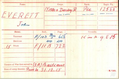 Exning. 1891 census...At Oxford Street, Exning were Vecus J (Jack) [2], his father Reuben[26], stableman, born Gazeley..his mother Mary [29], born Tuddenham.. brother Arhur [3] born Exning and sister Agnes [4 months] born Exning 1901 census...At Vine Terrace, Exning were Vicus, his parents, Arthur and Agnes and brothers Joseph Henry[8],William Albert[6],Reuben Harry [4] and sister Ellen Louisa, all the children Exning born. 1911 census...At Gas House Lodge, Welbeck, Worksop, Notts he is known as John Everett, a groom in a racing paddock. His father and stepmother, Joseph, William, Reuben Harry and Ellen together with Emma's brother William Simson are living at 2 Oxford Terrace, Oxford Street, Exning. Mary had died in 1908 and Reuben married Emma SWANN in Newmarket in Q4-1910 (apparently her 2nd marriage also). The address after Vicar's death was 7 Hillside Terrace, Exning. His records frequently vary as to the spelling of Vicars and of the surname. He was recorded as John by the Army and appears as such on the illuminated scrolls in the church. Our Exning Heroes is confused over the Regiment, the Regiment was the Sherwood Foresters (Notts and Derby) Regiment. The 9th battalion does not appear to have a particular name, unlike the 7th who were the "Robin Hoods". Vicar's entry in "Our Exning Heroes" reads as follows: Everett, V.J.. Jack Everett was in the Notts and Derby Regiment, having formerly been in the 9th Sherwood Foresters. He was in the Suvla Bay landing and was killed in action on August 9th, 1915, at the age of twenty-six. He sang in the parish church choir as a boy, and was a clever football player, being one of the Exning team, and representing the village in many of their matches. When war broke out he was working for the Duke of Portland at Welbeck Abbey, and had formerly worked for Lord Durham. |