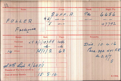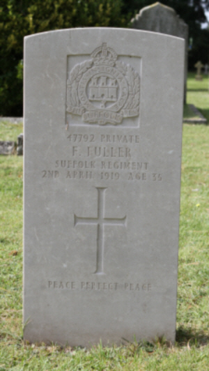 Frederick Fuller, a younger brother of Robert, was born in June, 1883, and at one time worked for Mr. Marriott. He was in Ireland when war broke out, and at once was despatched to France and fought in the Battle of Mons. He afterwards was sent to Egypt, where his illness began, which eventually terminated fatally. He was invalided home, but consumption set in, and after being for some time at Bury Sanatorium he was brought home to Exning, where he died on April 2nd, 1919 , and was buried in Exning Cemetery.