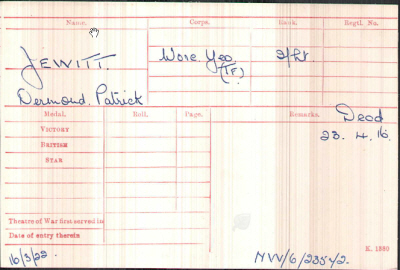 at Bedford Lodge and Machell Place, Newmarket, (one of the very few who have trained a Grand National winner and an Epsom Derby winner). 1901 census...at "The Beacon", Chevening, Kent were Dermod[6], born Newmarket..his widowed mother Annie [35], born Watergate, Sussex....sister Freda [15] born Newmarket, sister Olga [11], born Newmarket plus 6 servants. His elder brother Robert [13], born Newmarket, was a pupil at Quebec House School, Hastings. His eldest brother Reuben James Charles [16], born Newmarket, has not been found in this census, but he died in Australia in 1958 1911 census...Dermod was a student at Westminster College, Crowthorne, Berkshire. His mother, now Annie PECK was in Hunstanton with Dermod's sister Olga His mother re-married in 1901 in Sevenoaks, Kent, to Percy William Hesseltine PECK, the trainer at Harraton House, Exning. She died in 1912. In Dermod's will he left £5458/9/11 to Robert Jewitt (Underwriter) who was his elder brother. His Medal Index Card has no medal entries but he must have been entitled to Pip Squeak and Wilfred Dermod enlisted as a private in the Worcestershire Yeomanry on September 10th 1914, giving hs age as 20yrs 10 mths. He was 5' 10.25" (178.4 cm)tall, chest 34.5" to 37" (87.6 to 94 cm). He gave his next of kin as brother Robert JEWITT, of 93 Oxford & Cambridge Mansions, Hyde Park, London. (in 1919 at The Devonshire Club, St James' Street, London. His records refer to living at Bedford Cottage, Newmarket and being at Christs College, Cambridge. His commission was gazetted 1st March 1915. No records have been found of his travels as an officer other than that he was killed at or near the Suez Canal, and was originally buried just SW of Katia (Qatia?) Oasis. |