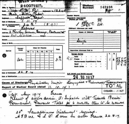 His death after discharge from the Army may explain his absence from "Soldiers Died". He enlisted at Bury St Edmunds on 26th Agust 1914, aged 21 yrs 5 months, 5' 7.5" (171.5 cm) tall and weighing 126 lbs (57.3 kg). He joined the 1st battalion and went to France on 27th July,1915. He was back in UK on 24th October, 1915. He was transferred to the 11th battalion on 14th June, 1916 on return to France. Promoted to unpaid Lance Corporal on 9/8/1916 and paid L/Cpl on 15/9/1916, he was wounded on the left arm on 26th August 1917 and returned to UK on 5th Septemeber,1917. Discharged as unfit for military duties on 1st November 1917 due to laryngial and pulmonary tuberculosis. He gave his address as that of his sister and next of kin, Elizabeth Neale, at 2 Rowley Terrace, Exning. Arthur's entry in"Our Exning Heroes" reads as follows: Neale, A.R. 7th Suffolks Arthur Robert Neale joined up during the first month of the war, and after several months' training went out to France. He took part in several battles on the Somme, and had some experience of bayonet fighting. He had to come home, as he was suffering from a bad foot, and he remained in England about a year. On going out again he was slightly wounded in August 1917, and owing to bad health rather than his wounds, came back to Blighty. He was sent to Stockport and Nantwich, and was finally discharged as unfit for further service on November 1st, 1917. He went straight to the Sanatorium for Consumptives at Bury, but the disease had got too great a hold, and he came home to Exning on December 20th. He died on January 28th, at the age of twenty-four. I was with him when he breathed his last, and know that his end was peace. |