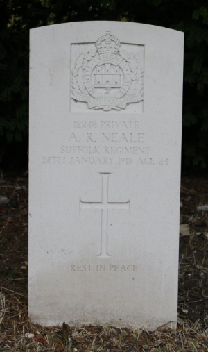 Born in Exning, Q2-1893 [Newmarket 3b:536], he was the 2nd son of Alfred and Jane NEALE (née MUSK) of Cotton End, Exning. 1901 census...At Cotton End were Arthur R [8], his father Alfred [41] Agr.Labourer,born Exning, his mother Jane [41] born Bressingham, his brother Alfred L [13] labourer, and sisters Ellen [12], Mildred [9] and Florence [6] and Grandmother Rebecca Neale [85]. All except Jane were born in Exning. 1911 census...Arthur was at Cotton End living with his brother Alfred, a cow keeper, like himself, and sister Florence and married sister Emily POWELL with her 10 month old baby Charles. Arthur's father had died in 1902, his mother in 1911 just before the census. |
