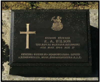 In the 1939 register, at The Cemetery, Exning, were his father William T. WILSON [20-7-1884] cemetery custodian; his mother Rosa [21-1-1889; brothers Reginald T [31-10-1919] warehouseman and Albert E [12-10-1921] van driver. There is one closed record. He was a brother of William WILSON and a cousin of Bryan WILSON |