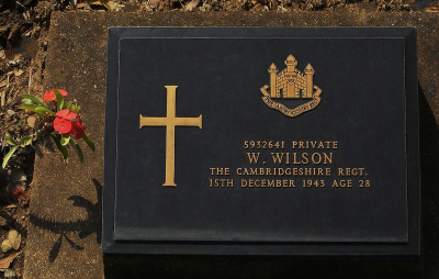 In the 1939 register, at The Cemetery, Exning, were his father William T. WILSON [20-7-1884] cemetery custodian; his mother Rosa [21-1-1889; brothers Reginald T [31-10-1919] warehouseman and Albert E [12-10-1921] van driver. There is one closed record. On enlistment he was a gardener |