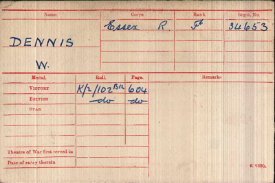 The above civilian history is put in doubt by this soldier's pension card (below) which seems to be at variance with CWGC. Frederic DENNIS married Mary RUMBELOW in the 2nd qtr 1891.