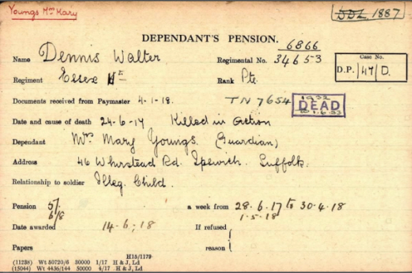 Walter DENNIS was born in Dullingham in 1892, the son of Frederick and Mary DENNIS (née RUMBELOW). There are 3 possible birth registrations in Newmarket which might be him, but the most likely is as here (Newmarket 2nd qtr 1892 3b:526)