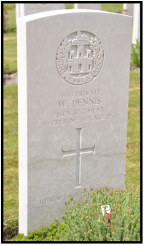 In June 1917 the 11th Essex were in the Lens coal-mining area in France, in trenches to the east of Loos. They left Le Brebis on the 20th June 1917 where they had been resting and returned to the firing line. They were at about half strength, consisting of 19 officers and only 514 other ranks. There was a raid and trench mortar barrage on the "C" Company position but it was fought off successfully with 12 wounded and one missing, but no major attacks. Walter was with "A" company and they lost Walter and one other man, both buried in Philosophe Cemetery,Mazingarbe, NW of Loos.