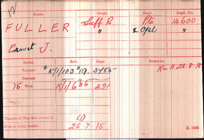 has him as 14600 Cpl Ernest Jude Fuller, Cambridgeshire Regiment, born in Freckenham. "Soldiers Personal Effects also has him in Cambridgeshires and mother Annie. 1891 census Grandfather Frederick [50], grandmother Sarah Ann[56] and their daughter Annie [15] were in Freckenham. 1901 censusAged 8, Ernest is in Freckenham with his grandparents. 1911 census In Freckenham, aged 18, with his grandparents and Annie FULLER ,single,aged 35.