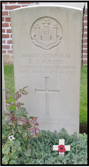 He enlisted in Newmarket. The 1st/1st Cambridgeshire were a territorial force who arrived at Le Havre in 1915. On May 9th 1918 they were transferred to the 35th Brigade in the 12th (Eastern) Division and absorbed more than 400 men from the 7th Suffolks. There is some confusion here as the medal index roll shows a Suffolk Regiment corporal Ernest J Fuller with number 14600 but dying on 28th August and no mention of the Cambridgeshires. Another medal index card shows an Ernest Fuller transferring from the Suffolks to the 1st/1stCambridgeshire but that man has a number 8644 and no such man appears to have died during the war. There is no medal card for an Ernest J Fuller in the Cambridgeshires, only Ernest William Fuller No 8644, a regular soldier. The battalion had 47 killed on the 22nd August, only seven have no known grave, they are commemorated on the Vis en Artois Memorial |