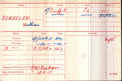 1911 census... Aged 15, a farm worker, he was now William RUMBELOW, at Freckenham Hall, with his step father William W RUMBELOW [47] a farmer, born Freckenham; his mother Ellen RUMBELOW [38], born Freckenham; sister Marjorie [11] and half-brothers Walter [9] and Norman [7] and grandmother, widowed Mary RUMBELOW [72] born Wickhambrook. All the children were born in Freckenham.