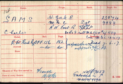 Charles Sams is buried in Chester Farm Cemetery, Belgium, grave 1:K:30