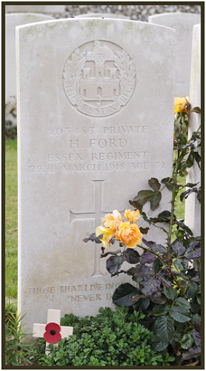 the Allies along the Somme, breaking through just about everywhere. The Regimental history says:- "The early morning was again misty and advantage was taken of this by the enemy to place machine gun fire and trench mortars a short distance from the wire. Their movements were observed and from 7.30 am. until 11 am. a number were shot down. No communication had been established with the artillery, so that its fire could not be directed, but apart from this disadvantage the situation remained much the same until 4.30 pm when report came that the enemy had broken through the corps line to the north of Morchies and was moving south-west, rendering the position of the 18th Brigade most critical. By 6.30 pm. it had become untenable, as the enemy penetrated the right flank and the Brigade was isolated, though for a time the stout resistance of two platoons of the Royal Scots afforded material aid. At midnight Brigade headquarters ordered withdrawal without waiting for relief. Buses were promised at the Monument, Favreuil-Sapignies road. but shells were falling around this point and no buses were available, so that the exhausted units of the Brigade staggered along the road to Buchanan Camp. All ranks fell asleep at each ten minutes halt, but there was no straggling, and at 6.30. am on March 23rd, seven officers and 77 other ranks marched steadily into camp." The final figure for those killed of the 11th Essex that day from CWGC is 52, and of these, 40 have no known grave. The inscription for the two brothers on the family headston in Haverhill read:- "Pte Frederick Ford…who died Feb 2nd 1919 whilst on leave from France. Aged 29 years… Pte. Harry Ford…brother of the above who was killed while on active service in France…March 22nd 1918 Aged 32 years". |