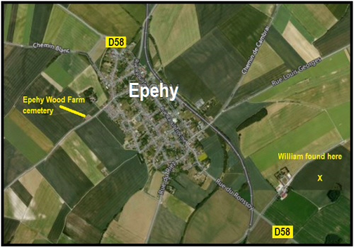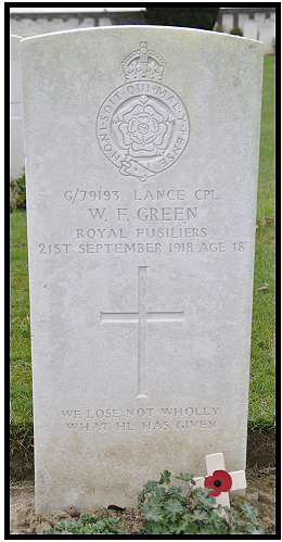 The war diary for September 1918 has not yet been found, but since he was found just west of Epehy in a temporary grave, that must have been quite close to the action. CWGC record 98 of the battalion killed, 82 of them buried in Epehy Wood Farm Cemetery now. His death was noted in the South West Suffolk Echo on 15th October 1918:- " Mr. and Mrs.E.C.Green of 59 High Street, Haverhill, have received official notice, this (Friday) morning that their son, Lance Corpl. William Frank Green, of the Royal Fusiliers, was killed in action in the field on September 21st. Deceased, who was only 19 years of age, joined up on February 28th last, and had been in France since early August. Prior to enlistment he assisted his father, who carries on a business of a stone mason." and in the South West Suffolk Echo on 16th November 1918:- "A short time ago we recorded the fact that Lance Corpl. W.Frank Green,of the Royal Fusiliers had been killed n action. Since then his brother, Major Coote Green, who is in command of a squadron at Hastings, has been endeavouring to gain further particulars, with the following result:- "I am in receipt of your letter re your brother, Lance Corpl. Green of my Company. He was killed by a machine gin bullet during an attack on a farm near Epehy on the 21st September. As N.C.O. he was excellent, and was doing very good work when he met his death. We cannot afford to lose good N.C.O's at the present time, so his loss is not only felt by his Platoon but by the whole Company. He is buried in Dullah ( Deelish) Valley Cemetery, which is about a thousand yards east of Epehy He was found as shown below and re-interred in Epehy Wood Farm Cemetery in August 1919 |