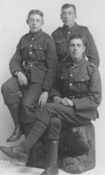 Right: William (standing) with Bert Newman (seated front) and Bert Wallis (perched). All joined the Royal Fusiliers.