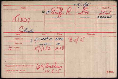 Charles Kiddy was born in 1882 in Haverhill (Haverhill Q2-1882 4A:564) son of Harry and Kate KIDDY (née HARDY). CWGC have his age wrongly as 39 years. His mother died in Q1-1884 aged 21 and father then married Fanny BIGMORE.(Risbridge Q4-1886 4A:1055) (but in 1891 according to 1911 census) 1891 census...Aged 8, he was at Moon Hall Cottages, Bumpstead Road, Haverhill with his father Harry KIDDY [29] farm labourer born Helions Bumpstead; his stepmother Fanny [24] born Kedington; half brother Frederick [4 months] born Haverhill. 1901 census...Aged 18, a hair weaver, he was at 3 Bumpstead Road, Haverhill with his father; stepmother; half brothers Frederick and David [1] born Haverhill; half sister Maude [2] born Sturmer. 1911 census...Aged 28, single, a hair cloth weaver, he was at France Cottages, Sturmer with his father; stepmother; half brothers Frederick and David; half sisters Maud, Daisy [8] and May[4] both born in Sturmer. His half brother Frederick was killed serving in France in the Suffolk Regiment in 1916 see here |