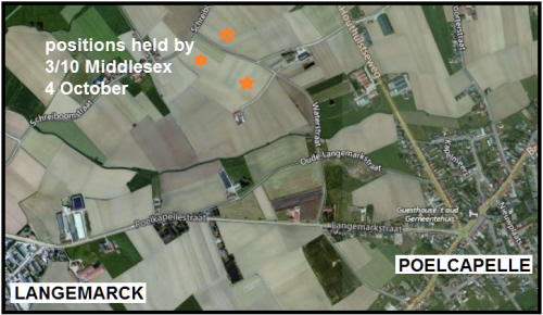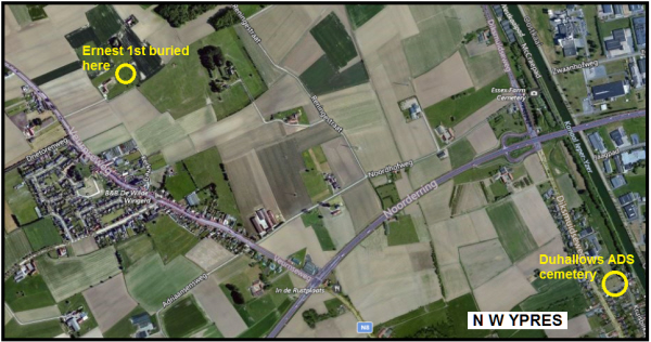 He enlisted in Aldershot. After leaving Liepzig Camp on 2nd October the battalion war diary for the 4th October 1917 tells us that: 'The starting point was 100 yards north of Eagle Trench… At 6 am (zero hour) on the 4/10/17 our artillery barrage started and the two leading companies B and C moved forward to Eagle Trench followed by D and A Coys at about 8 am. B.H.Q. started to move forward to Eagle Trench and had not gone more than 300 yards before the C.O. was knocked down by a splinter from a shell and the Battalion Intelligence Officer was wounded in the wrist by a shell. B.H.Q. found it impossible to move forward owing to the intense barrage. After the C.O. had recovered from the knockout blow B.H.Q. moved to Eagle Trench where O.C.Seaforths had returned from Kangaroo Trench....OC Seaforths informed CO 3/10 Middx Regt that the whole of his Battalion had been absorbed in the attack. The enemy kept an intense barrage on Eagle Trench 4th and 5th Oct and it was almost impossible to move, a lot of stretcher cases were killed coming down with their bearers..... The 1st Royal Warwicks arrived at about 4 pm on 4/10/17 and filled up the gap in the line with 2nd line of 11th Brigade and later pushed forward and got in touch with the remainder of the 2nd Seaforth and 3/10 Middx Regt' . After being wounded in this action,Ernest would have been taken for treatment at a dressing station. He died on 5th October 1917 and would have been buried close by. In 1919 his father was informed that his body had been moved to a permanent resting place in Dunhallow Advanced Dressing Station Cemetery. |