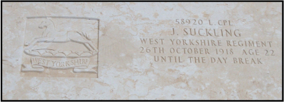 1901 census...Aged 5, he was at 4 Mount Road, Haverhill with his father John SUCKLING [28] bricklayer; his mother Eliza [29] born Toppesfield, Essex; sisters Elizabeth [6] and Hilda [11 months]; brother Stanley [2]. All except his mother were born in Haverhill. 1911 census... Aged 15, Marine store's assistant, he was at 10 Mount Road, Haverhill with his parents (mother a hairweaver); sisters Elizabeth, Hilda and Freda [3]; brothers Stanley, Edward [8], Reginald [6] and Conrad [1]. On Army form 5080 in 1919 his father recorded all the family living at 10 Mount Road, Haverhill, parents, brothers Stanley Arthur [21], Edward [17] Reginald [15] and Conrad [10]; sisters Elizabeth [25], Hilda [19] and Lily [8] |
