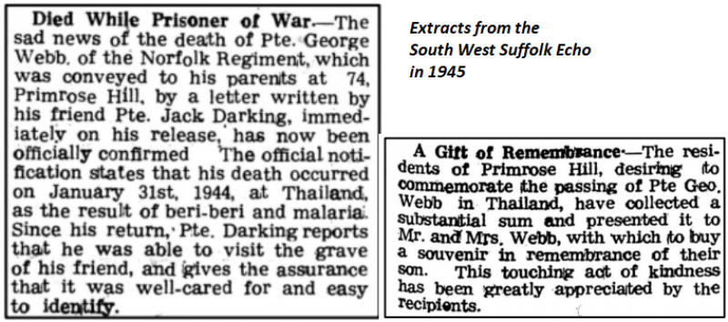 The convoy, with the rest of the 18th Division, sailed for Bombay on 13 December but the USS Mount Vernon proceeded to Mombasa, arriving on Christmas Day when shore leave was granted. On 28th December they set sail again for their final destination, Singapore where the 40 Officers and 917 Other Ranks comprising the 5th Battalion Royal Norfolk Regiment disembarked on 13th January 1942. On arrival, lectures in Japanese tactics were given to all ranks. On 15th February 1942, with no naval or air support the Allied Forces surrendered to the Japanese Imperial Army and those captured spent the next three and a half years as POWs. At this time the strength of the 5th Battalion Norfolk Regiment was 30 Officers and approximately 600 Other Ranks. They had lost 10 Officers and approximately 300 Other Ranks during the intense fighting of the previous four weeks. For many of the POWs the time was spent in Thailand constructing a railway which the Japanese hoped to use in their advancement to India. Conditions were extremely harsh, food was scarce, malnutrition was widespread and many died of disease. The Haverhill Echo reported on 17 July 1943 that Mr and Mrs Webb, of 74 Primrose Hill, received a postcard from their son saying he was a Prisoner of War. This was the first news they had received from him since January 1942. On 1st January 1944, the Haverhill Echo reported that they had received further news from their son. The postcard was dated 21st February 1943 and stated that he was safe and well. They were to receive 2 more postcards by July 1944, both undated, saying that he was interned in Thailand. In truth, George had died from Beri Beri and Malaria on 31st January 1944, before the last postcards were received by his parents. |