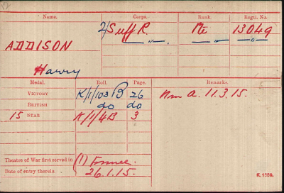1891 census...Aged 2, he was at Sapiston with his father John ADDISON [31] farm labourer born Honington; his mother Elizabeth [28] born Stalham, Norfolk and sister Emily [2] born Honington. 1901 census...Aged 12, he was at Hall Farm Cottage, Herringswell with his parents (father a Cow man on farm) and sister Emily. 1911 census...Aged 22, a farm labourer, single, he was still in Herringswell with his parents. CWGC and the pension card have his parents at Hall Farm Lodge, it is not clear if this was still the same address |