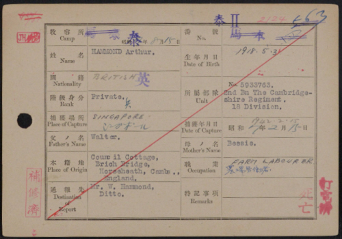In 1939 his father Walter HAMMOND [2/3/1882] a horseman, and mother Bessie [29/4/1883] were at 1 Council Houses, Shudy Camps Road, Horseheath. With them was HUGHES and his wife Olive. On Arthur's PoW card the address is Council Houses, Brick Bridge, Horseheath, and he had been a farm labourer.. |