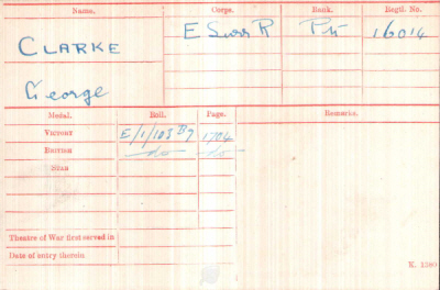George Clarke was born in Isleham on 14th July 1891 (Newmarket Q3-1891 3B:515) baptised in Isleham on 30th August 1891, the son of Robert and Emma CLARKE