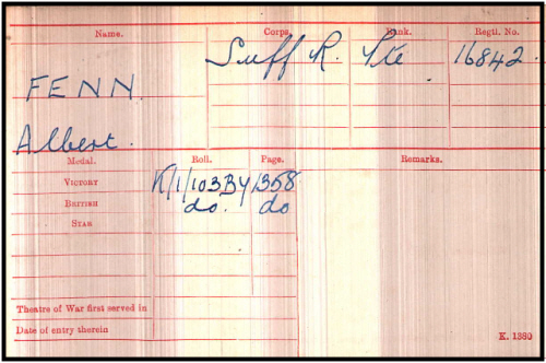 Most likely it is Newmarket Q4-1894 3B:510. This man answers some of the questions 1901 census...Aged 8, Albert Fenn was at Holmsey Green, Beck Row with his father William FENN [31] farm labourer born Greenwich, London; his mother Ellen [32] (née SMITH) born Mildenhall; sisters Minnie [10] and Florence [6] both born in Isleham, brothers Richard [4] and Arthur [1], both born in Mildenhall. 1911 census...Aged 18 he seems to be the Bert FENN working for and lodging with Frederick and FINCHAM at "?? Farm", West Row. His parents were at Holmsey Green,Beck Row with his brothers Richard, Arthur and John [3]; sisters Daisy [10], Ethel [8] and Doris [4]. All the new siblings were recorded as born in Mildenhall. His Army records add to the confusion as they give his next of kin as brother Edward, who has not been found in any other records. On the Register of Soldiers Effects the legatees are brother Arthur and sister Minnie. It is also likely he is the "Bertie" FENN on the Beck Row memorial. Sadly this soldier's pension card simply has his number rank and name, no other details He is apparently the brother of Richard FENN on the Beck Row memorial. click here |