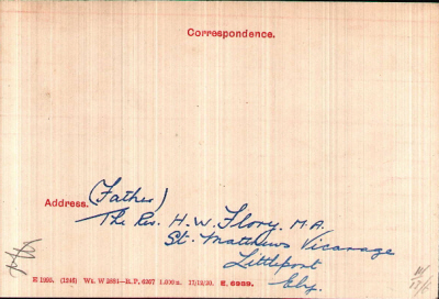 1901 census...Aged 4, he was at 60 Charminster Road, Bournemouth, with his mother, Ruth W.FLORY [29] born in Oxford, brother William H [5] born in Chesterton, Cambridge, sister Ruth E.[3] born in Somerton, Oxon and sister Dorothy V [1] born in Bournemouth. His father Henry William FLORY [32] a merchant tailor, born in Oxford, was visiting his own mother Mary at 4 Beckett Street, Oxford. His mother died in 1906 and his father re-married in Chelmsford on May 1st 1910 to Alice Maude KING. 1911 census...Aged 14 he was a grocer's clerk, living at St John's Lodge, Church Street, Cambridge with his father (now lay curate at St John 's); his step mother Alice Maude [23] born in Chelmsford, his brother William Henry (a bootmaker's assistant), invalid sister Ruth Mary and sister Dorothy Violet, also a brother, Arnold Augustine [8] born in Bournemouth and half sister Mona Isobel [4] born in Poole. Records show his father as vicar at St Matthew's, Littleport and in Waterbeach before arriving at St Andrew's in Isleham. The exact dates have yet to be established. His elder brother, William Henry died in France in March 1918. see here and a younger brother, Arnold Augustine died in Liverpool in September 1918. see here |