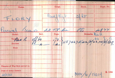 Percival FLORY was born in Somerton, Oxfordshire (Headington Q4-1896 3B:858), the son of Henry William and Ruth Willice FLORY (née CLEAVER).