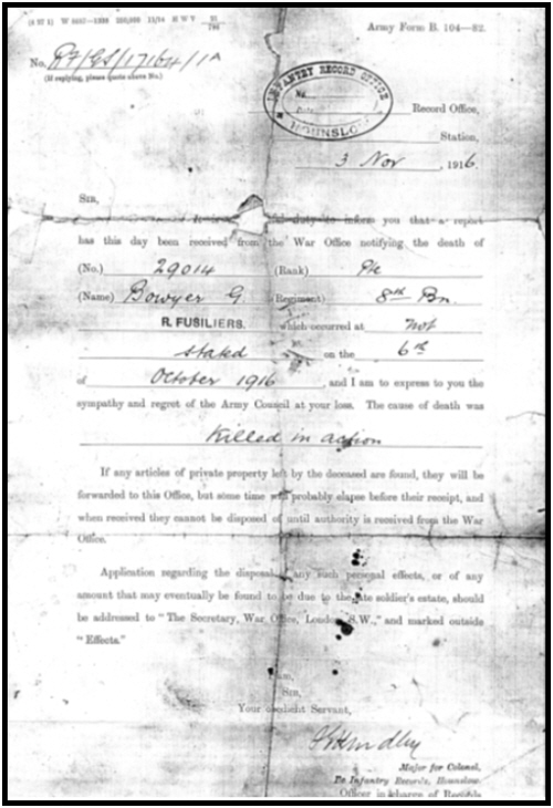 He enlisted in Sudbury. His sole legatee was sister Emma May MAYES. The Royal Fusiliers had four battalions side by side at the time, 8th, 9th, 26th and 32nd. They were pushing forward towards Transloy, gathering between High Wood and Le Barque preparing for an attack on BAYONET Trench on the 7th, which may account for the low casualties on 6th. CWGC gives the toll for the 8th Royal Fusiliers as 6 killed