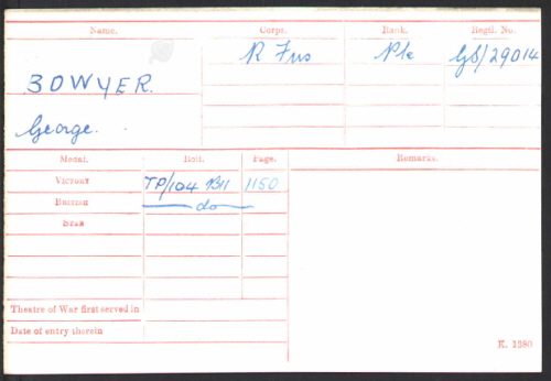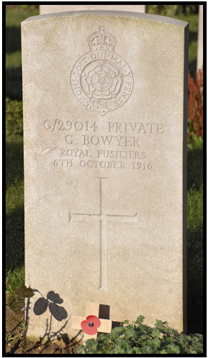 1891 census...Aged 8, he was at Union Road, Kedington with his father Elijah BOWYER [40] bricklayer; his mother Elizabeth [34]; brother David [11]; sisters Emily [5], Alice [3] and Emma M [4 months]. All were born in Kedington. His mother died in 1897 and his father married widow Hermon Jane ARGENT (née BALDRY) in 1898 1901 census...Aged 18, he was at Union Road, Kedington with his father; stepmother Jane [50][ born Naughton, Suffolk; sisters Emily and Emma; brothers Harry [7] and Thomas [5], both born in Kedington. His father died in 1909 1911 census...Aged 28, single, stone pit labourer, he was at School Road, Kedington with his widowed step-mother Hermon Jane; brothers Harry (stone pit labourer) and Thomas (farm labourer). His mother was at Rectory Road, Kedington on the pension card. His brother Harry died of his wounds serving in France in the Suffolk Regiment in 1917 see here His brother Thomas was killed in action serving in France in the Suffolk Regiment in 1916 see here |