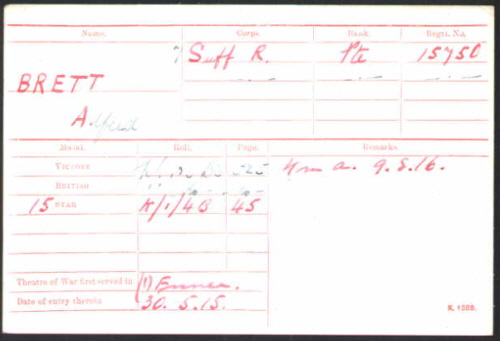 1901 census...Aged 6, he was at Clock Hall Farm, Hundon with his father James BRETT [32] farm labourer born Hundon; his mother Mary Ann [30] born Hundon; brothers Ernest [4] born Kedington and John [9 months] born Hundon; sister Elsie E [2] born Kedington. 1911 census...Aged 16, a farm labourer, he was at Sim's Farm, Kedington with his parents; brothers Ernest Cecil (farm labourer), John, Thomas Edward [8], Frederick Percy [7], Bertie Charles [5], William Victor [3]; sisters Elsie Elizabeth and Frances Susannah [1]. His mother and brother John were born un Hundon, the rest were all born in Kedington. One of the 10 siblings had died. CWGC have the family address as Brickwall Cottages, Hundon His brother Ernest Cecil was killed serving in France in the Suffolk Regiment in 1916 see here |