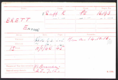 1901 census...Aged 4, he was at Clock Hall Farm, Hundon with his father James BRETT [32] farm labourer born Hundon; his mother Mary Ann [30] born Hundon; brothers Alfred [6] born Kedington and John [9 months] born Hundon; sister Elsie E [2] born Kedington. 1911 census...Aged 14, a farm labourer, he was at Simm's Farm, Kedington with his parents; brothers James Alfred (farm labourer), John, Thomas Edward [8], Frederick Percy [7], Bertie Charles [5], William Victor [3]; sisters Elsie Elizabeth and Frances Susannah [1]. His mother and brotherJohn were born un Hundon, the rest were all born in Kedington. One of the 10 siblings had died. CWGC have the family address as Brickwall Cottages, Hundon His brother James Alfred was killed serving in France in the Suffolk Regiment in 1916 see here |