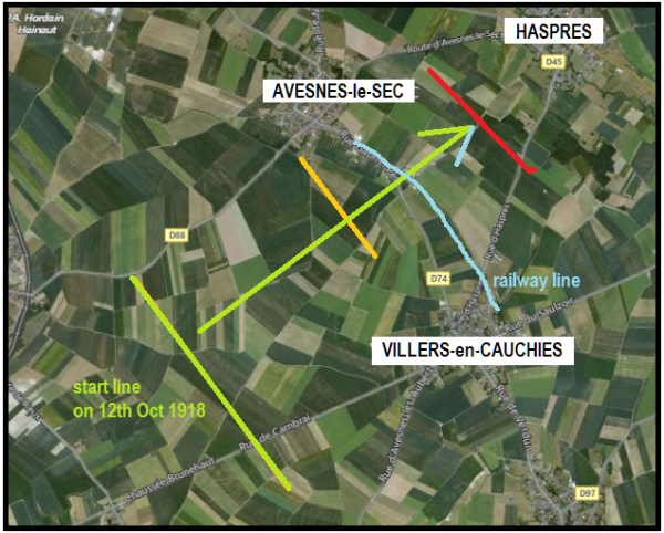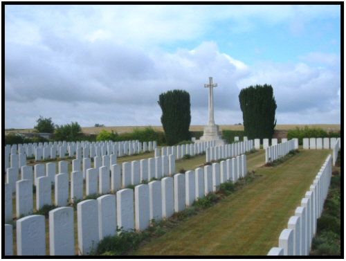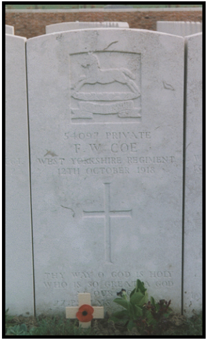 His service record survive in the "burnt documents" albeit badly damaged. What can be read however is here:- He attested on 14th August 1917 and was placed on Reserves. He was mobilised on 26th September 1917 at Greenwich, giving his age as 18 years 26 days, born in Kedington. He was 5 feet 6.25 inches (168.2 cm) tall, weighed 115 lbs (52.3 kg), chest 32" to 35" (81.3 to 88.9 cm). An engine driver for S.M.G Coy, he lived at Old Woolwich Road, Greenwich and named Miss Edith Ford of 13 Lambs Lane, Greenwich as his next of kin. Initially in the 97th Training Reserve Battalion, he was transferred to the 51st Grad Bn, Royal Sussex Regiment. Via J Depot on 30th April 1918 he was posted to the BEF on 1st May and transferred to the 1st /5th Battalion, West Yorkshire Regiment, joining them in the field on 6th May 1918. He received a gun shot wound to the head on 12th October and died later that day. His belongings were sent to his mother Mrs Julia Sargeant of 41 Blackley Buildings, East Greenwich, London, who completed the living relatives form on 20th August 1919, giving father as deceased, herself as mother, grandfather William COE, aunt Harriet COE and uncles William Willis COE, John COE and Richard John COE, all at Rectory Road, Kedington. She is given as his sole legatee. He had died during what is commonly known as the Pursuit to the Selle, a mobile phase close to the end of the war. The 1st/5th West Yorks were advancing towards Haspres from Avesnes-le-Sec. By using http://rdf.muninn-project.org/TrenchCoordinates.html and map sheet 51a you can trace their movements on a Google earth view ..... 1st/5th Battalion war diary :- "The battalion was ordered to continue the attack in conjunction with 51st Division on the left and the 147th Brigade on the right. The frontage allotted to the battalion was 1,200 yards extending from 51a.O.31.d.0.5 to U.2. central. The objective for the day was line AVESNES- VILLERS-EN-CAUCHIES RAILWAY. The formation adopted by the battalion for the attack was "D" Coy on the left with 3 platoons in line of sections in file and one platoon in support in artillery formation. "A" Coy on the right in the same formation with "C" Coy in support to "D" Coy, and "B" Coy in support to "A" Coy. The battalion commenced the attack without a barrage at 11:15 and moved rapidly forward until reaching a line O.27.b.central -O.35.a.00.60 when heavy machine gun fire from AVESNES-LE-SEC was encountered. The Coys in the 1st wave extended and were reinforced by "B" Coy which came up on the right and the advance was held up for approximately 5 minutes after which it was continued, the objective being reached at 12:45. the enemy put down a heavy barrage immediately the 1st wave began to move forward and this continued until the objective was reached. Very few of the enemy were actually encountered, he appearing to rely on long range machine gun fire and his protective barrage. On arrival at the objective "D" Coy on the left, "A" Coy left centre, "C" Coy right centre, "B" Cot on right commenced to dig in and advance posts pushed forward on a line with the QUARRIES. Battalion HQ moved forward in rear of the attack and established itself in the RAILWAY STATION O.28.b.0.5. Information having been received the the 147th Brigade on the right had pushed forward, two platoons per Coy were ordered to to establish advanced posts on the high ground O.22.b - P.26 central to conform with the 51st Division on the left and the 147th Brigade on the right. The line was subsequently advanced to approximately O.17.central -O.23.b to WOOD O.30.b.9.3.and as the Division on the left failed to conform"D" Coy threw out a defensive flank running O.17.central to O.18.d.9.1. At 22:55 the battalion was ordered to trickle forward to the RIVER SELLE and attempt to secure crossings over the river in order to cover the building of bridges. One platoon under 2nd Lt H Berghoff went forward with the objective of seizing the bridge at O.18.a.central. This platoon failed after two attempts to reach its objective in consequence of heavy machine gun fire. Another platoon under 265375 Sgt KAVANAGH went forward to secure a crossing at P.19.a., it reached the river at this point where it dug in and remained until the evening of the following day. when it withdrew to conform with the right and left flanks. CASUALTIES- wounded 2nd Lt ;BENNETT, killed 12 other ranks, wounded 29 other ranks. The following wire was received from the Divisional Commander, Major General N J G CAMERON. CB, CMG :- "warmly congratulate you and your battalions on the very fine advance you made yesterday.I think that it very materially helped the general situation even though some of the ground won could not be held. Please communicate to all ranks and explain that enemy retreat today largely due to your efforts yesterday." CWGC records show 15 of the battalion dying on the 12th October 1918. NOTE:- The map co-ordinates converter (the link above) is an excellent way of working out where troops were operating, just remember that the sheet number is not always given so a little home work is necessary first. The same site can find where bodies have been found (to within a 50 yards, even 5 yards square) from the concentration cards now on line on CWGC website. Dying of his wounds we cannot be certain even which day Frederick was wounded, but if he died the same day,this is the area,below 12th October..objective -railway line photo: Commonwealth War Graves Commission click here to go to the Commonwealth War Graves Commission website for full cemetery/memorial details |