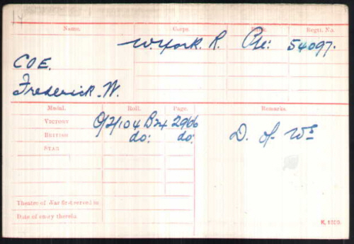 Frederick William COE was born in Kedington (Risbridge Q3-1899 4A:799), baptised in St Peter and St Pauls, Kedington on 8th October 1899, son of Julia COE.