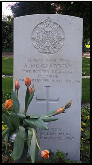 I found this on the net Joe Hardy, then the Signal Platoon Sergeant, 1st Bn The Border Regiment, recalled that 'all Airborne soldiers were supposedly Volunteers -it was judged to be a risky business. The way in which they had us volunteer was to announce that in future the Battalion was to be designated an Airborne Unit (glider), and that those men who did not want to take part in Airborne Operations should report to the Orderly Room and apply to be transferred to other units. We had one man in the Battalion who had sufficient guts to say that he did not want to fly; he was transferred out, and the rest of us were deemed to have volunteered.' The War Diary of 1 Border records that some 30 Other Ranks (OR's) left the Battalion on 30 December 1941 as 'unfit' for the new role. The emblem of Bellerphon and Pegasus was designed by a Major Edward Seago and authorised to be worn with the title AIRBORNE on the upper arm of the Battle Dress blouse, the maroon berets were issued soon after. From www.warcemeteries.nl comes the follwing:- Before World War II McGladdery served with the 1st Battalion Border Regiment. He was recalled at the outbreak of war and took part in the Sicily landings. McGladdery served with B Company, with the Company Headquarters, as Company Sergeant Major. According to the Roll of Honour published by the Society of Friends of the Airborne Museum (Jan Hey 1999 and 2011) McGladdery died of wounds in the St. Antonius Hospital at Utrecht. He was mortally wounded when a group of men, mainly from No 13 and No 14 platoons, tried to retake the Westerbouwing on 21 September.